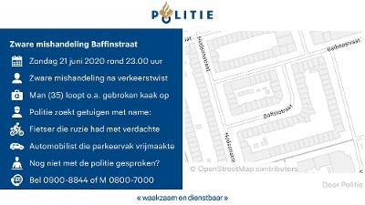 Het slachtoffer stond rond 23.00 uur ter hoogte van huisnummer 14 te wachten op een parkeerplaats die vrij zou komen. Echter de bestuurder van een bestelbus met een vermoedelijk Bulgaars kenteken was hem voor. Als het slachtoffer daar iets van zegt, dan rijdt de bestuurder van de bestelbus weer weg, maar komt lopend terug, kennelijk om verhaal te halen. Hij mishandelt het slachtoffer zo ernstig dat deze o.a. een gebroken kaak oploopt.