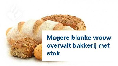 Met een puntige stok in haar hand kwam ze de bakker binnen en eiste geld. Toen ze dat kreeg, verdween ze snel op de fiets richting de Oudedijk, via de Willem Ruyslaan. De blanke vrouw is mager en droeg zwarte kleding en een petje. Ze heeft zwart haar over de schouders. Er raakte niemand gewond. De politie onderzoekt de overval en roept getuigen op zich te melden. Ook camerabeelden zijn zeer waardevol voor het onderzoek.